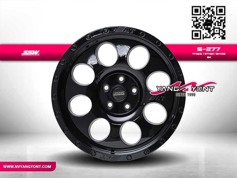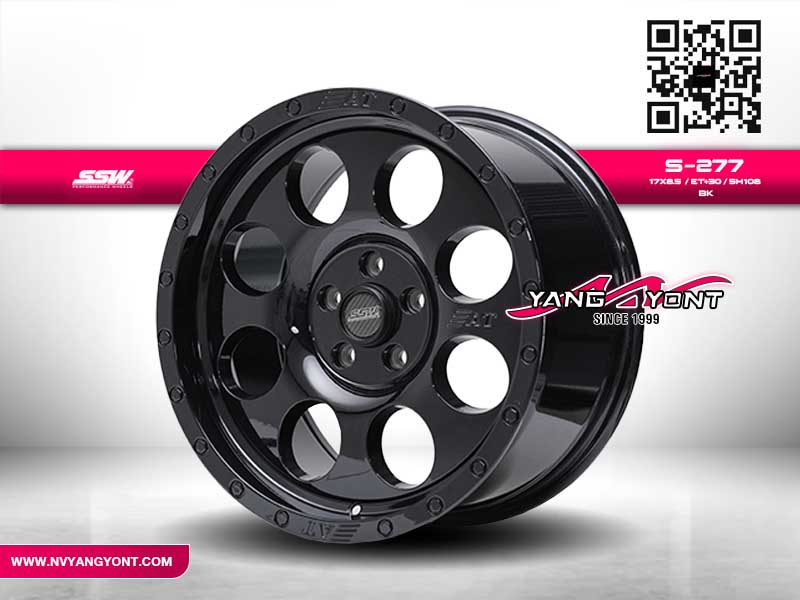 ล้อแม็ก SSW รุ่น S-277 ขนาด 17x8.5 นิ้ว ออฟเซ็ต ET30 เจาะ 5 รู 108 สีดำเงา ดีไซน์ทรงเรียบแต่โดดเด่นด้วยลวดลายรูวงกลมใหญ่รอบดุมกลาง ให้ลุค Off-Road / Adventure พร้อมความแข็งแรงและความแกร่งในสไตล์ 4x4 หรือลุยเมืองแบบดุดันก็ลงตัว